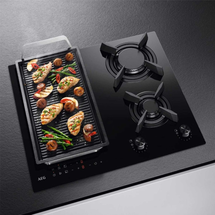 AEG ბრენდის გაზქურის ზედაპირი, რომელიც გამოირჩევა პრაქტიკული დიზაინით და ყოველდღიური გამოყენებისთვის მოსახერხებელი ფუნქციებით.