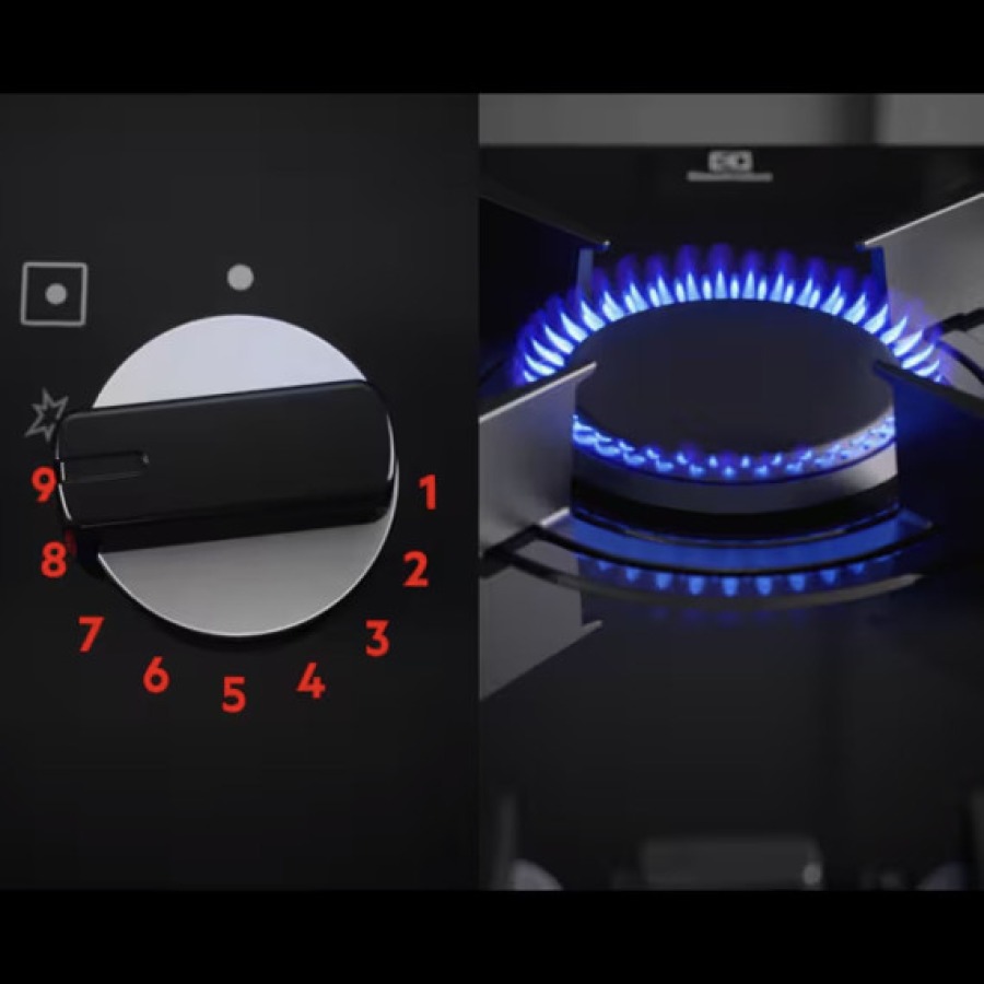 ELECTROLUX ბრენდის გაზქურის ზედაპირი, რომელიც გამოირჩევა პრაქტიკული დიზაინით და ყოველდღიური გამოყენებისთვის მოსახერხებელი ფუნქციებით.