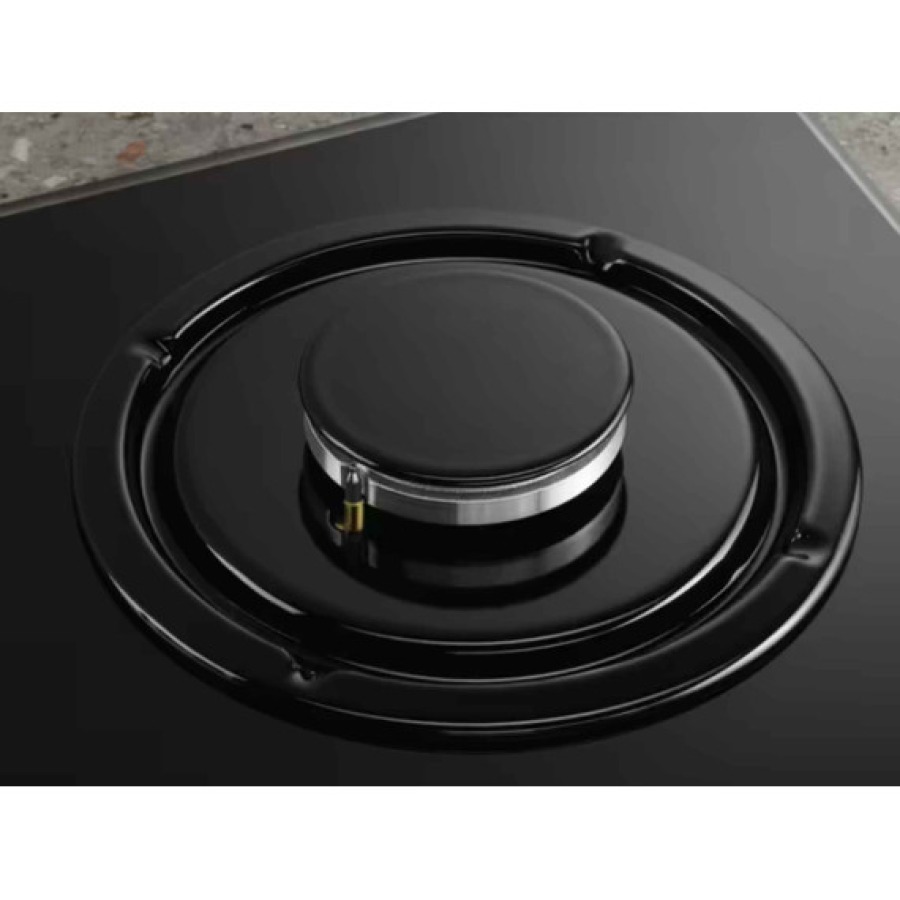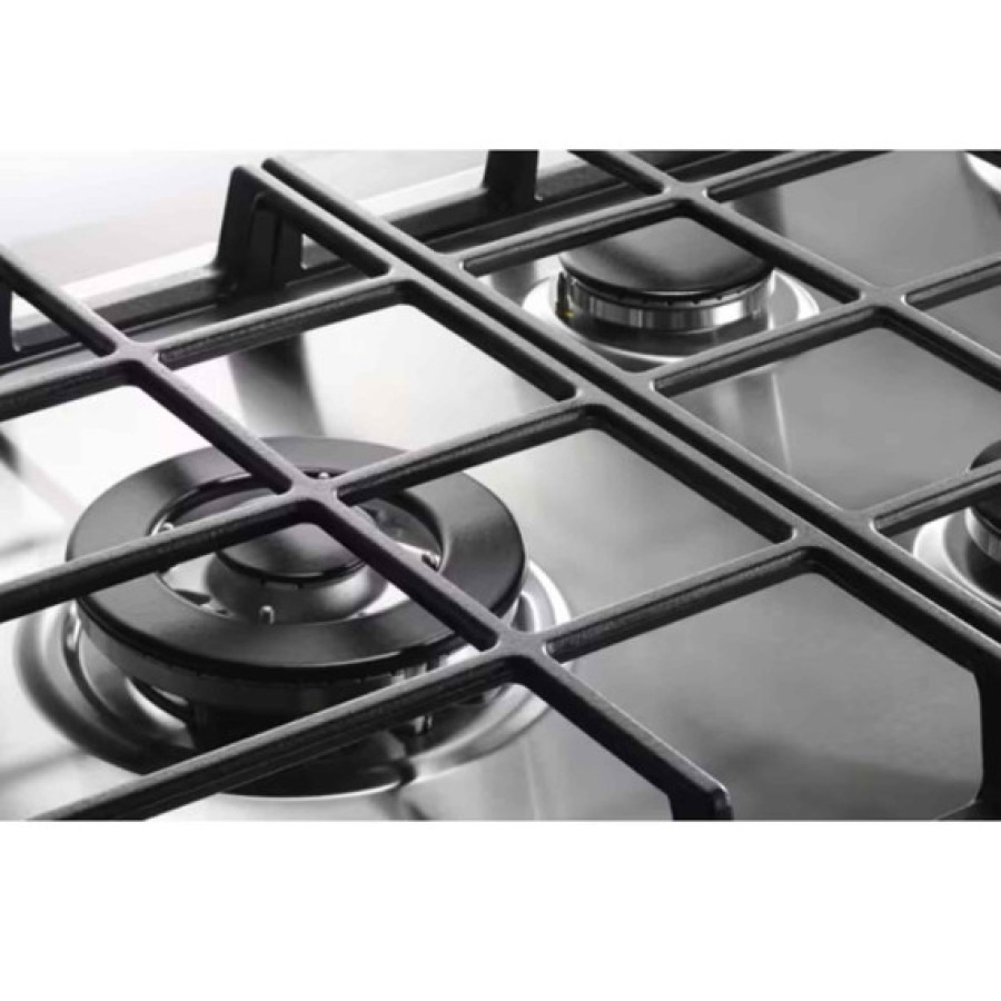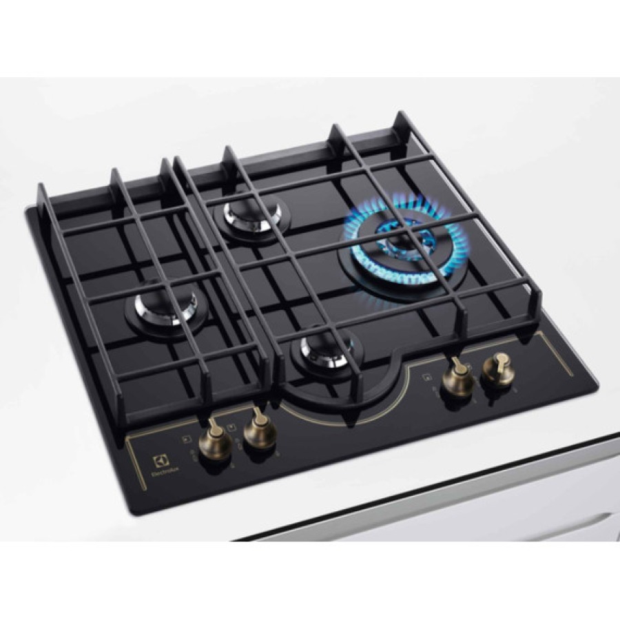 ELECTROLUX ბრენდის გაზქურის ზედაპირი, რომელიც გამოირჩევა პრაქტიკული დიზაინით და ყოველდღიური გამოყენებისთვის მოსახერხებელი ფუნქციებით.
